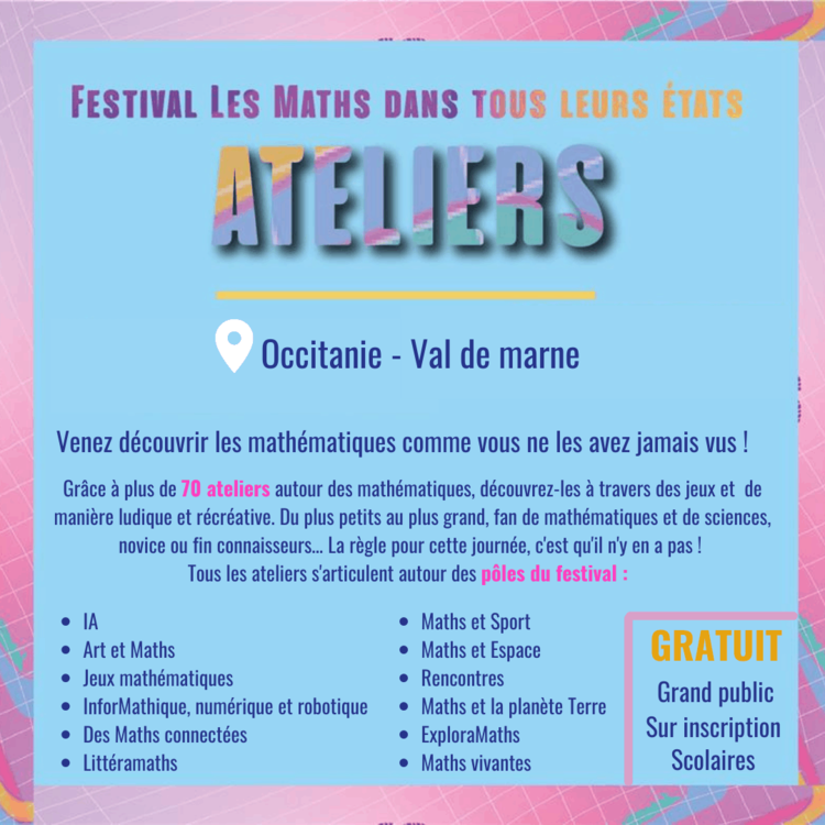 À l'occasion du festival "Les maths dans tous leurs états", plus de 70 ateliers seront proposés à destination des scolaires et du grand public. Les ateliers s'articulent autour des 12 pôles du festival: IA, Art et Maths, Jeux mathématiques, InforMathique, numérique et robotique, des Maths connectées, Littéramaths, Maths et Sport, Maths et Espace, Rencontres, Maths et la planète Terre, ExploraMaths, et Maths vivantes. Les ateliers permettent de découvrir les mathématiques de façon ludique et récréative.