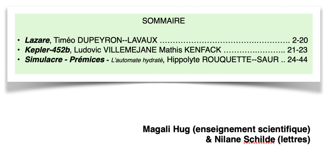 Dans le cadre de l’appel à projet Hydrogèn’Oc du dispositif Adage, les professeurs de SVT et de lettres ont travaillé conjointement afin d’amener les élèves à écrire une nouvelle de science-fiction intégrant les données présentées en enseignement scientifique sur l’hydrogène comme vecteur d’énergie. Les élèves devaient comprendre et maîtriser ces données scientifiques afin de pouvoir les intégrer dans une trame narrative dont les contraintes leur avaient été indiquées.