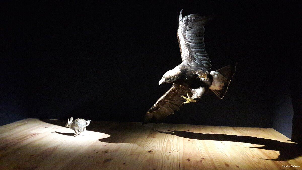 Je continue ma visite en entrant dans la quatrième pièce sombre et rougeoyante. On nous invite ici à nous imaginer au théâtre. Je me retrouve donc face à une petite scène en bois sur laquelle les rapaces sont mis en lumière. Qu'il s'agisse de prédation ou de charognage, ces scènes naturalistes, permettent de mieux rendre compte des activités alimentaires des rapaces ainsi que des particularités de chaque espèce.