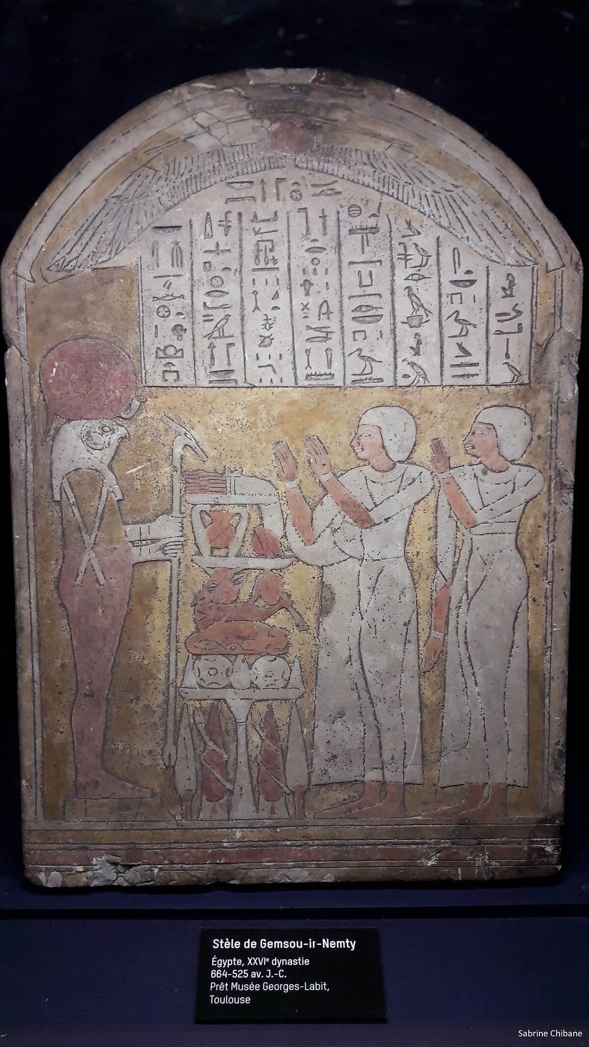 Sous la scène théâtrale je découvre la magnifique stèle de Gemsou-ir-Nemty, prêt du musée Georges-Labit, illuminée pour inviter les visiteurs à un voyage dans l’Égypte antique où les oiseaux ont toujours tenu un rôle privilégié. Le vautour avec ses grandes ailes protectrices représente la déesse de la maternité Nekhbet.