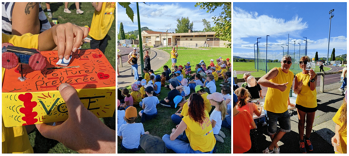 Magali et Delphine quant à elles coordonnaient l’homologation des voitures (9 voitures ont pu prendre la ligne de départ) ; organisaient les défis de vitesse, d’endurance et de livraison et ont remis les prix aux vainqueurs. L’ensemble des enfants et adultes présents à la journée (une petite centaine de personnes) ont pu prendre part au vote « de la plus belle voiture » ! Sans trop de surprise, la voiture à paillette a remporté une majorité de suffrages. 🤩😉😂