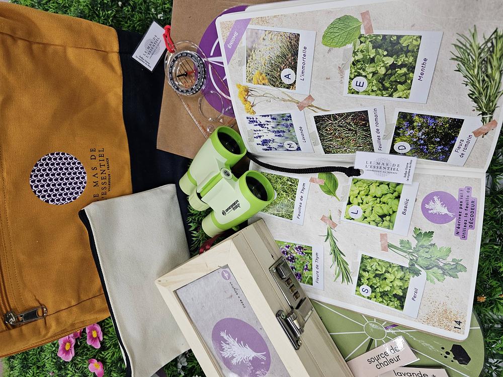 Scénario : Cet objet (un cryptex) a été trouvé pendant la rénovation de la savonnerie mais il est impossible de l’ouvrir… Votre mission est de retrouver le code complet composé de 6 lettres. Pour trouver ces lettres vous devrez résoudre l’ensemble des énigmes dispersées sur le domaine du Mas de l’Essentiel. Je vous remets un sac à dos contenant plein d’objets. Ils seront tous utiles pendant votre enquête. Vous y trouverez notamment un carnet. Ce carnet est votre allié ! Il vous permettra de résoudre les énigmes mais également de vous aider si vous êtes coincés car il contient des indices (il y a 3 niveaux d’aide possible).