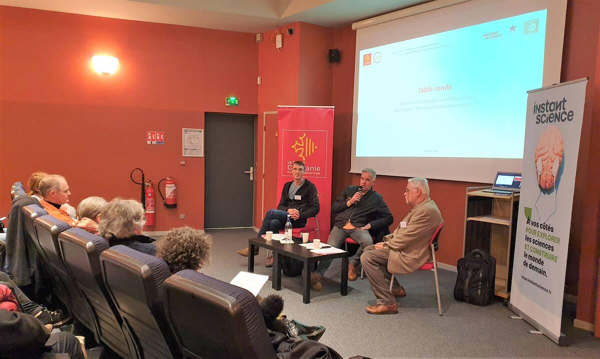 Centrée autour de la question « Comment le tourisme peut-il réinventer l’expérience en montagne ? », cette rencontre professionnelle a démarré avec une table ronde pour questionner la place des sciences dans les lieux touristiques et la mise en tourisme de lieux scientifiques. Initialement, quatre intervenants devaient être présents, cependant la date de cette rencontre coïncidait avec un mouvement de grève national et une météo peu clémente. Daniel Soucaze des Soucaze, directeur du Pic du Midi et Joël Combes, chargé de mission tourisme durable au Parc national des Pyrénées étaient invités à l’occasion de cet échange pour partager leur retour d’expérience et échanger avec les professionnels présents.