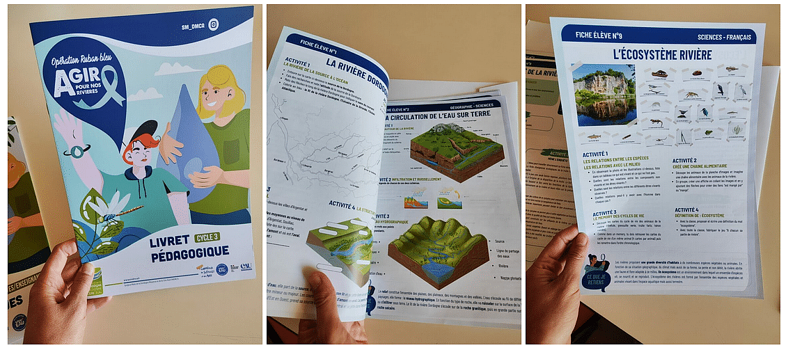 Le Syndicat Mixte de la Dordogne Moyenne et de la Cère Aval (SMDMCA) a été retenu à l’appel à projet EDUC’EAU émis par l’Agence de l’Eau Adour-Garonne, afin de réaliser sur son territoire une grande campagne de sensibilisation sur le thème de l’eau, des cours d’eau et des zones humides. Baptisée "Opération Ruban bleu, agir pour nos rivières", le programme qui en découle inclut un cycle d’animations grand public, des animations scolaires (en classe et sur le terrain), la création de livrets (grand public et pédagogique) ainsi qu’un jeu de 10 fiches pédagogiques pour les enseignants et élèves.