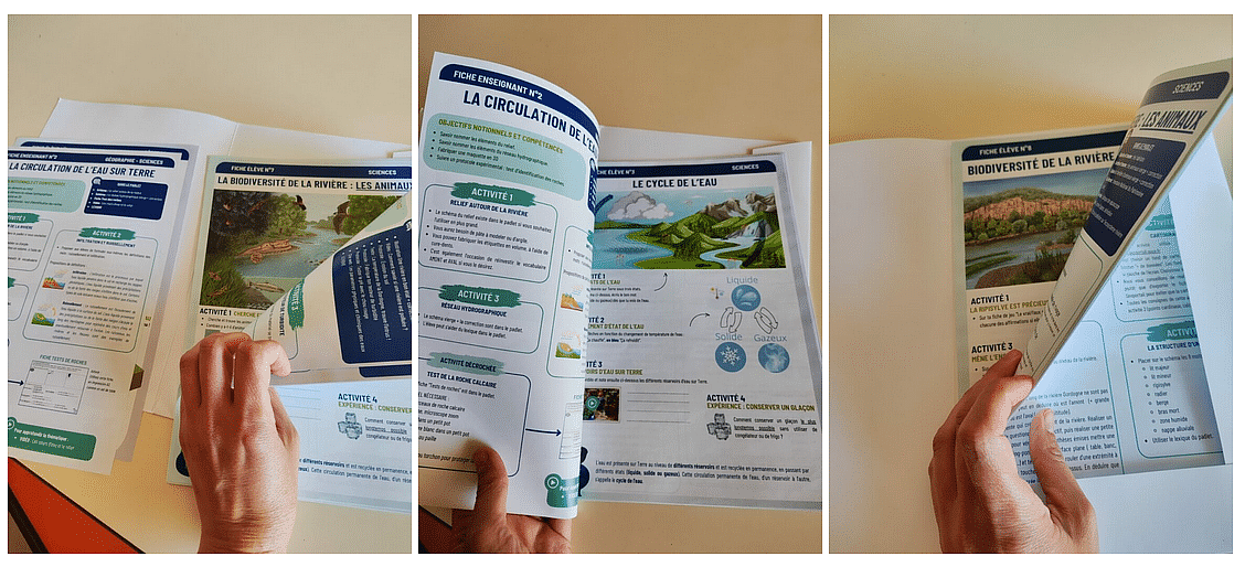 Chaque fiche est conçue de la même façon : le recto pour l’élève, le verso pour l’enseignant. Les 10 thématiques abordées sont : la rivière Dordogne, la circulation de l’eau sur terre, le cycle de l’eau, les milieux aquatiques, les usages de l’eau, une rivière en bon état, la biodiversité de la rivière : les animaux, la biodiversité de la rivière : la ripisylve, l’écosystème rivière et la classification des animaux de la rivière.