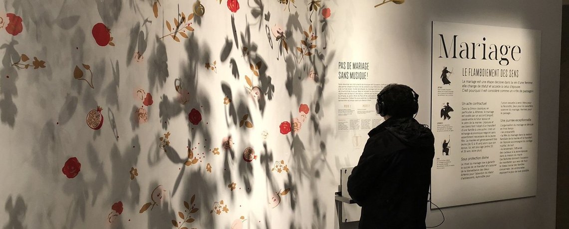 À peine entrée, c’est un magnifique panneau explicatif reprenant le graphisme de l’exposition qui accueille le visiteur. On comprend rapidement ce sur quoi l’exposition va nous emmener, à savoir, 4 temps forts de la vie des Grecs (le mariage, les sacrifices, le banquet et les funérailles) tous empreints de rituels religieux et invariables qui étaient censés garantir l’équilibre du monde et la bienveillance des dieux !
