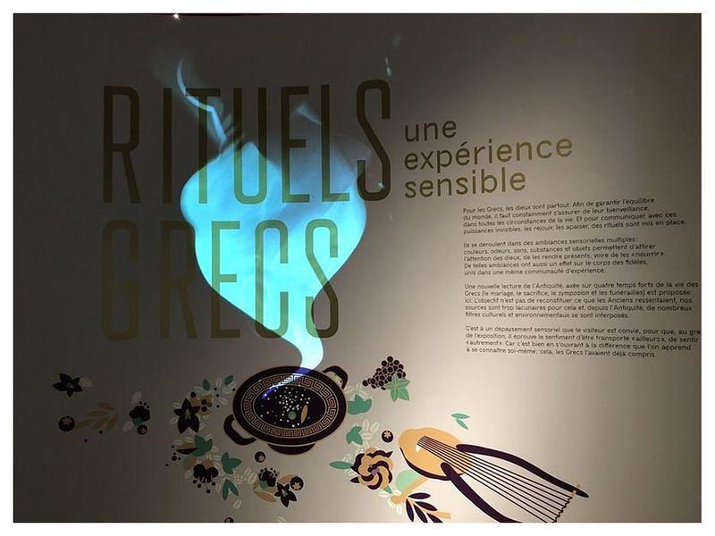 « Bien sûr ne disposant ni de photo ni de vidéo permettant de retracer les rituels avec justesse, l’exposition Rituels Grecs est le fruit d’un rigoureux et minutieux travail de recherche sur les textes par les universitaires du laboratoire PLH-Erasme de l'Université de Toulouse 2 Jean-Jaurès pour reconstituer la richesse comme la diversité polysensorielle de ces rituels ; recherche appuyée ici par des prêts européens exceptionnels, dont celui particulièrement généreux, du Musée du Louvre » (Source : Exposition « Rituels Grecs, une expérience sensible »)