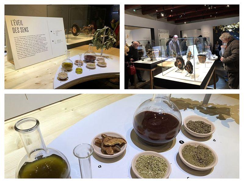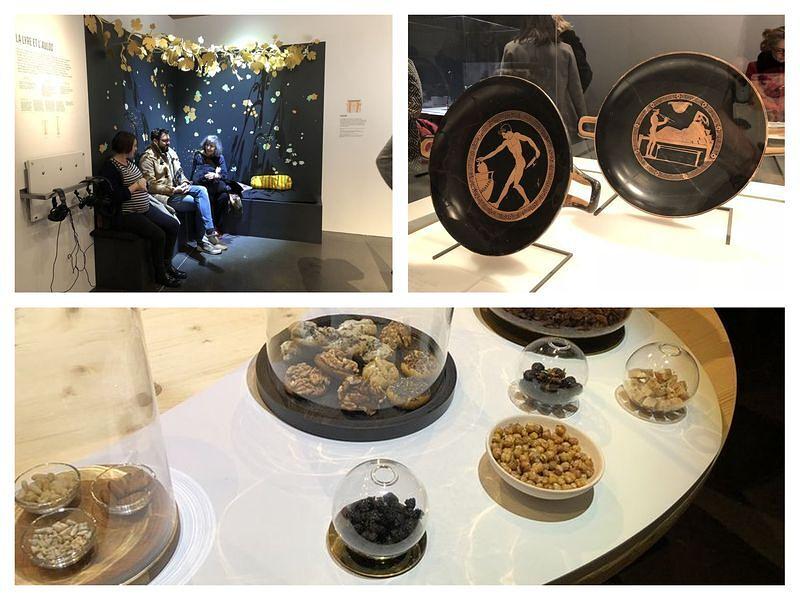 J’ai l’eau à la bouche, je ne tarde pas à me faire une idée des sensations gustatives de l’époque en goûtant quelques raisins secs. Quelques notes de musiques et je m’affale sur les banquettes reconstituées. Elles aussi étaient de rigueur lors des banquets pour pouvoir s’allonger à son aise. Je commence à imaginer les convives improviser des chants au rythme de la lyre (instrument dont la caisse de résonance était de carapace de tortue) comme cela pouvait se faire à l’époque.