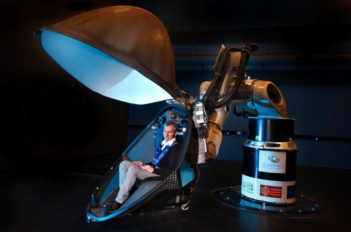 Photo : Le simulateur de mouvement iMose, conçu par Buck Engineering & Consulting, est constitué d'un bras robotique et d'une cabine de pilotage. (c) Patrick Aventurier