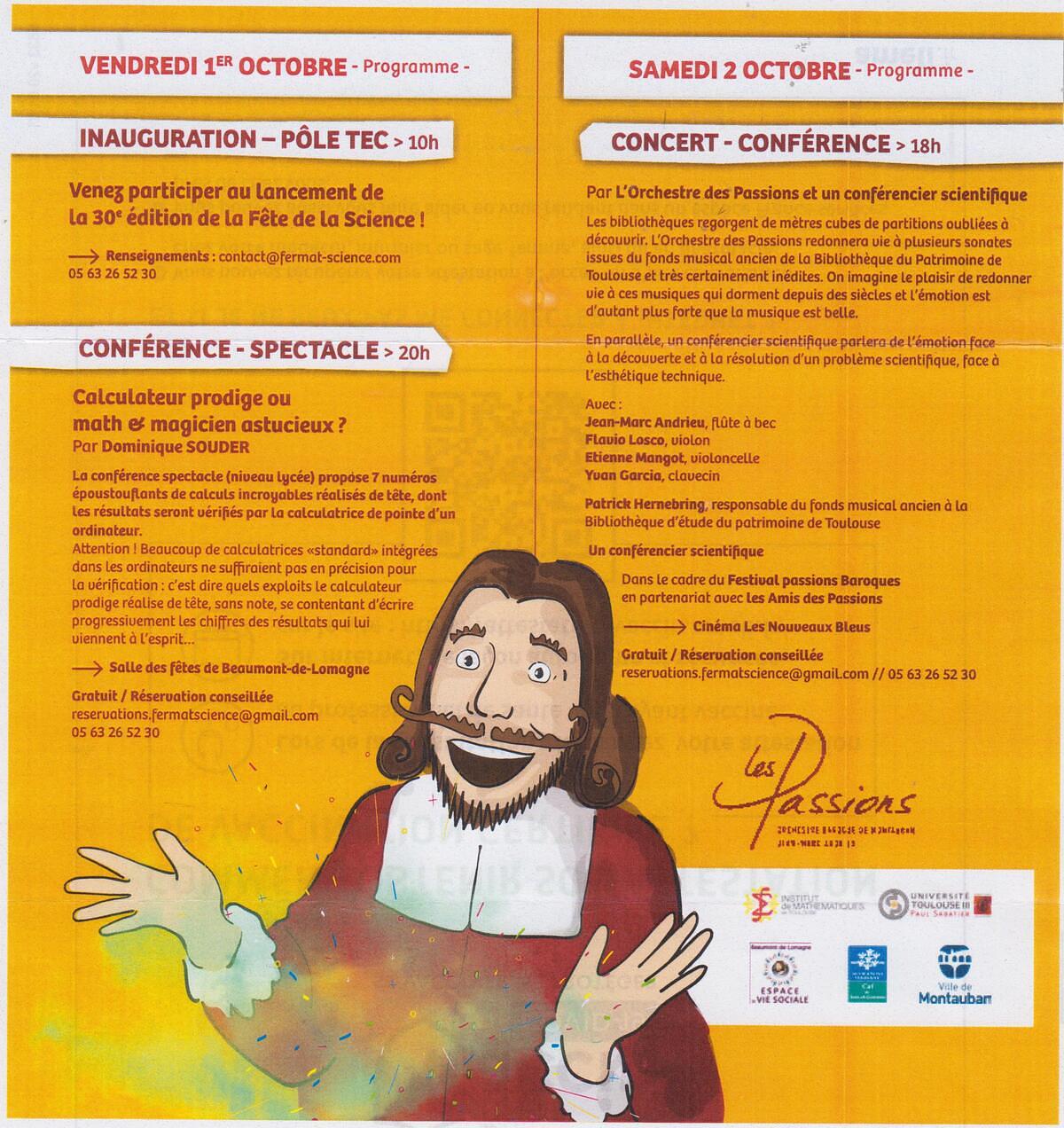 Du 1er au 3 octobre 2021, dans le cadre de la 30e édition de la Fête de la science en Occitanie, l’association Fermat Science a mis en place dans la bastide de Beaumont pour le grand public toute une série d’animations, de rencontres propres à créer l’émotion grâce une programmation riche et ludique et notamment à plusieurs spectacles.