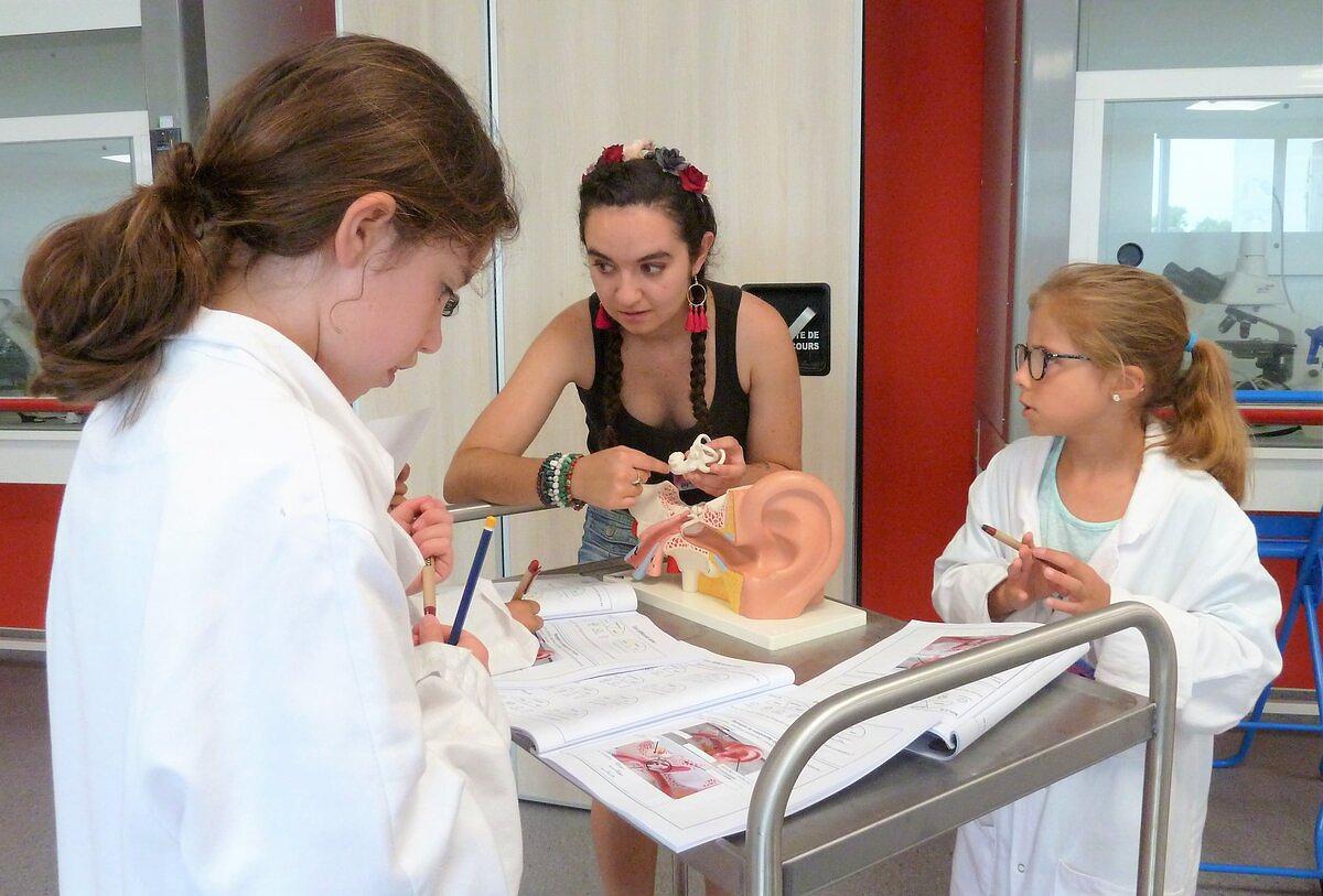 L’audition était le sujet de recherche lors du deuxième jour. Ils ont commencé avec une présentation riche en vocabulaire et notions complexes comme la fréquence et l’intensité. Puis ils ont découvert les différents composants de l’oreille (externe, moyenne, interne). Ils ont ensuite observé des osselets à la loupe ainsi que des coupes de Cochlées au microscope. L’après-midi, les enfants sont devenus un son en rentrant dans une oreille géante. Ils ont passé toutes les étapes qui la composent, du conduit auditif jusqu’à la Cochlée où ils ont codé un message électrique pour le cerveau. Ils ont ensuite incarné une chauve-souris pour comprendre l’écholocation et revoir les notions de fréquence et de champs auditifs. Et enfin, ils se sont amusés sur des minis ateliers « son et mémoire ».