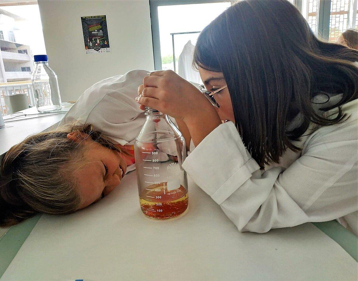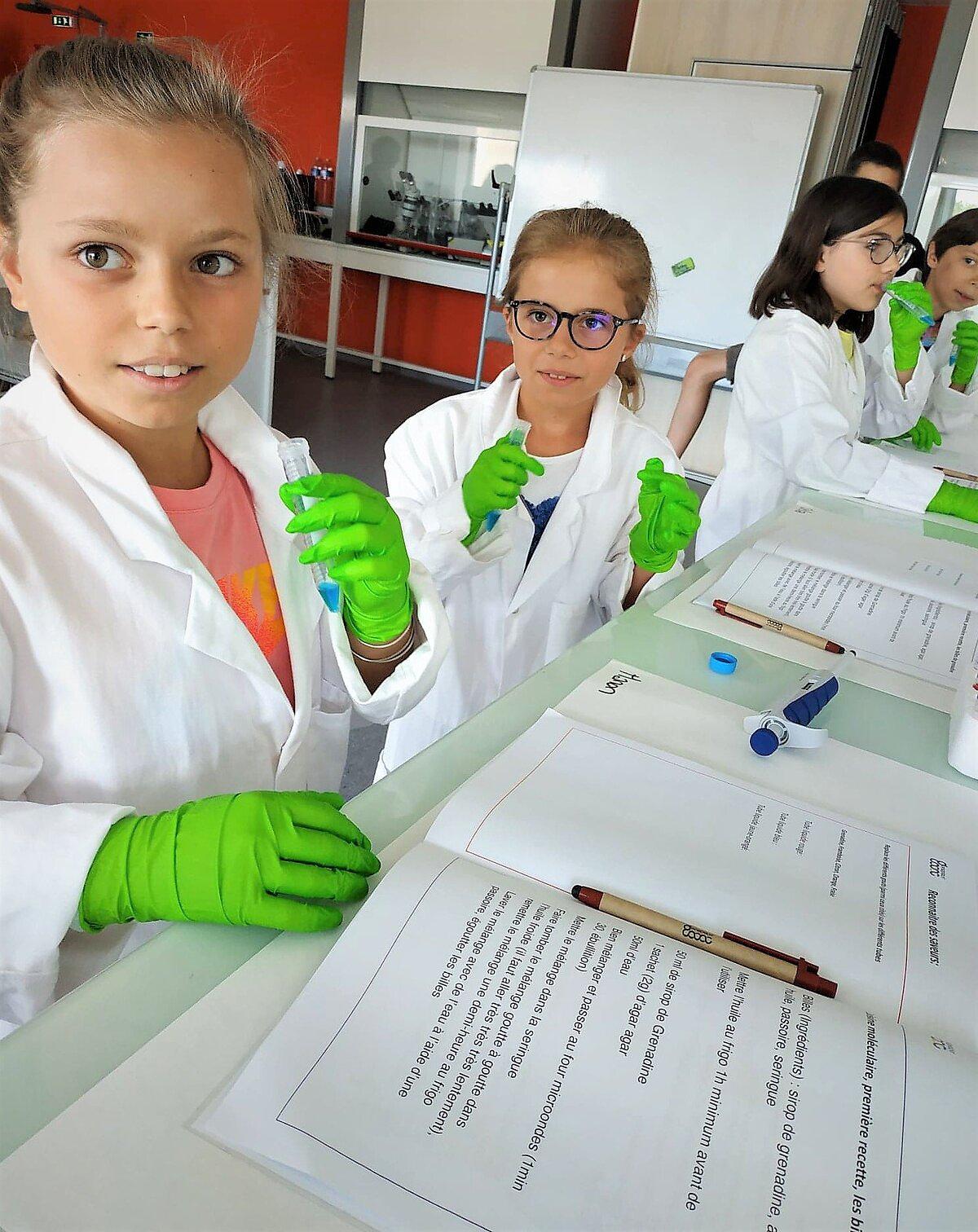 Pour le dernier jour, les enfants ont remis blouses, lunettes et gants pour…le goût ! Cuisiniers très particuliers d’un jour, ils ont préparé des recettes de cuisine moléculaire et discuté de chimie avant de déguster leurs mets avec leurs parents l’après-midi même. Les enfants ont également pu présenter chacun un atelier de la semaine à leur famille.