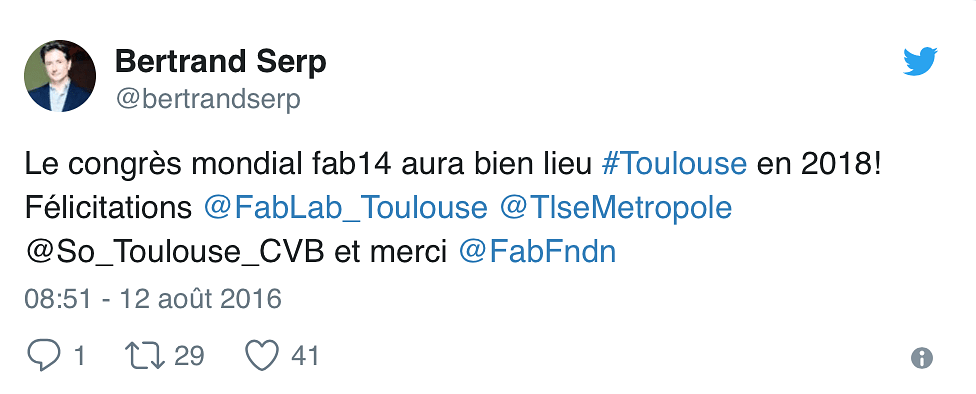 Pour finir, je vous annonce que la ville de Toulouse a été retenue pour accueillir le congré mondial des FabLabs en 2018 ! C'est une grande opportunité pour aller vous renseigner sur le site du Fablab et ainsi, pourquoi ne pas vous réserver quelques heures l'année prochaine pour vous y rendre...