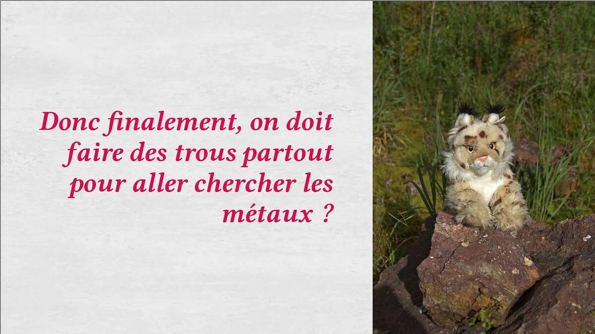 Après une brève introduction de la géologie et du rôle du géologue dans la société, et à travers les interrogations du petit lynx toujours curieux, nous avons évoqué la nécessité de réaliser la transition énergétique et les défis qu'elle impose, notamment l'électrification massive en remplacement des énergies non renouvelables carbonées. Nous sommes ensuite partis du cas pratique de la consommation en métaux nécessaire pour concevoir un smartphone avec la projection d'une courte vidéo réalisée par l'Université de Plymouth, avant de faire la transition vers la voiture électrique et les panneaux photovoltaïques.