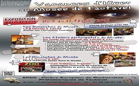 Le musée vous propose de participer à un atelier sur les techniques préhistoriques de 14H30 à 17h. Le cerveau et son évolution depuis les premiers hommes le 6 février. Les différentes manières de faire du feu depuis la préhistoire, les 7 et 17 février. Les bijoux dans la préhistoire, les 8 et 16 février. Confection de lampes à graisse, les 9 et 12 février. Les parures du néolithique, les 10 et 14 février et Confection de poteries néolithiques, le 15 février.