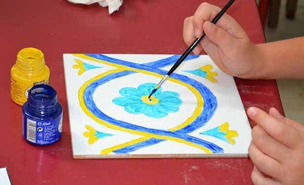 Après une présentation des techniques de fabrication et de décoration des faïences depuis le Moyen Age jusqu'au XVIIIe siècle, chaque enfant réalise, sur un carreau de faïence blanche, un décor, en camaïeu de bleu et de jaune, inspiré des motifs des anciennes faïences.