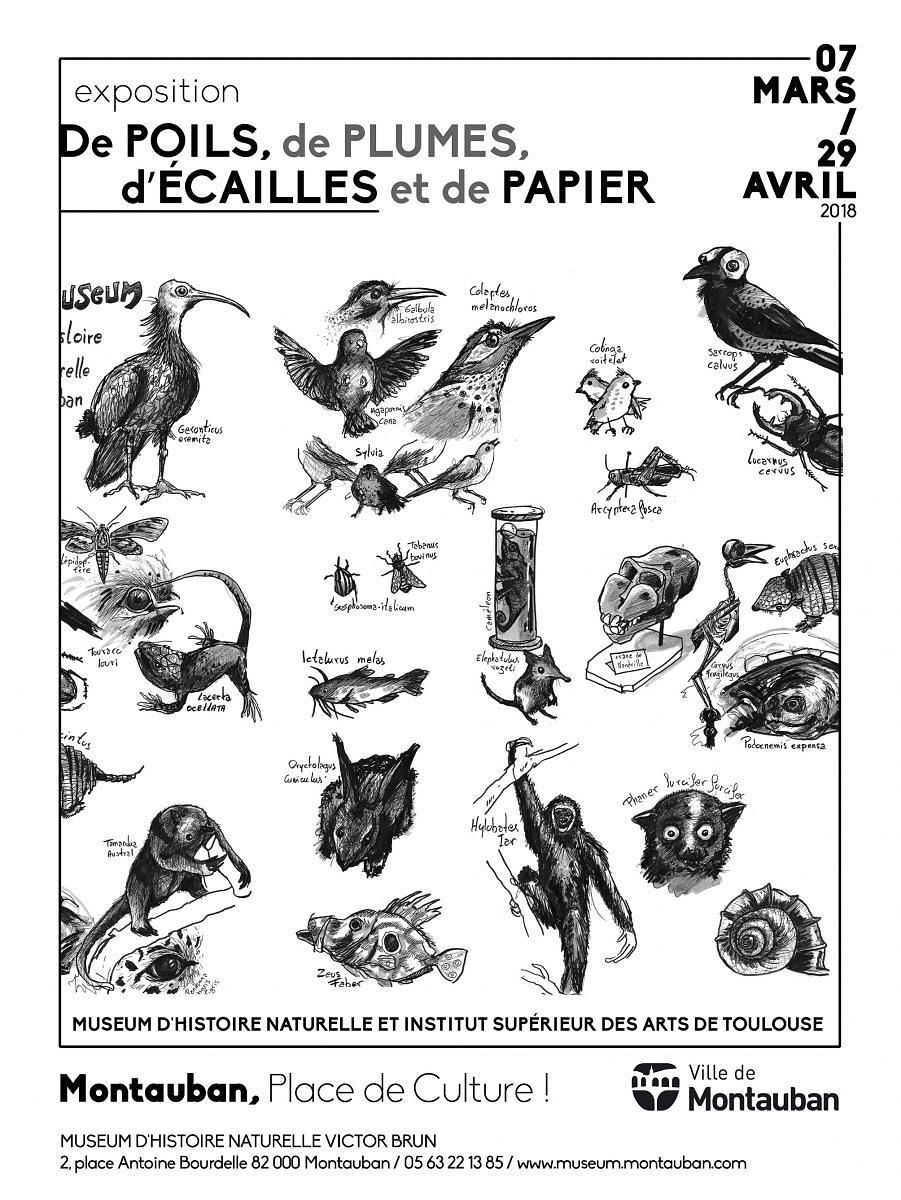 À partir du 7 mars, le Muséum vous propose une exposition temporaire en collaboration avec l'ISDAT (Institut des arts de Toulouse) intitulée "De poils, de plumes, d'écailles et de papier".