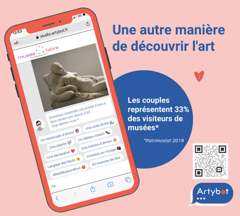 Avec sa version Lovebot, il vous guide plus précisément dans un parcours amoureux destiné aux couples (33 % des visiteur·se·s d’un musée (Patrimostat 2019)) dans les collections du musée Fabre de Montpellier, qui a fait appel à eux pour la Saint-Valentin 2021.