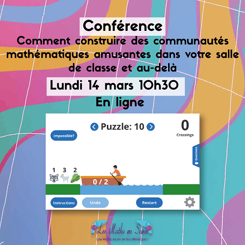 - le lundi 14 mars à 10h30 heure française en anglais : Intervention de l’américain Daniel Kline. À quoi ressemble les mathématiques amusantes ? Et si je n’ai pas le temps de faire des maths amusants ? Et si je n’ai pas les ressources pour faire des maths amusants ? Ces questions ont toujours été difficiles, mais à cause du COVID, il est plus difficile que jamais de créer des communautés mathématiques joyeuses et collaboratives pour nos jeunes apprenants. À notre séance, vous aurez une expérience pratique avec l’un de nos puzzles préférés, riches en mathématiques.