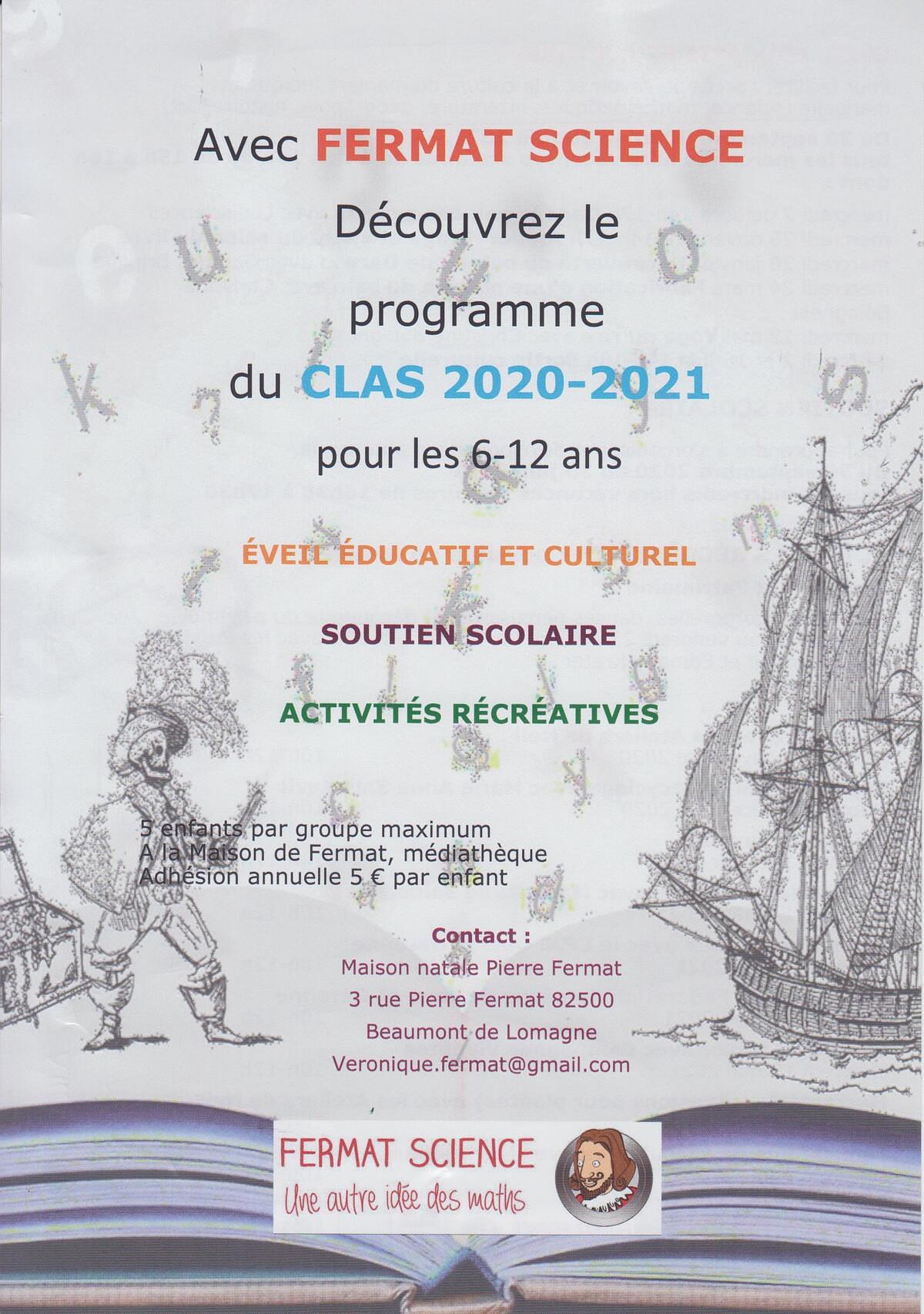 Le Contrat Local d’accompagnement à la Scolarité (CLAS) géré par l’association Fermat Science continue, malgré le confinement, d’accueillir à la Maison Fermat les enfants de Beaumont-de-Lomagne et de la Communauté de Communes de la Lomagne Tarn-et-Garonnaise, en toute sécurité dans le respect des règles sanitaires.