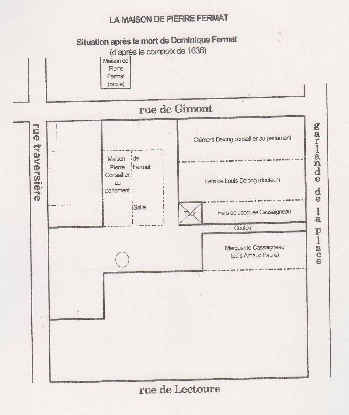 D’autre part un compoix de 1536 reprenant un compoix plus ancien datant de 1548 ont été retrouvés par un historien local, Pierre Gairin. Ces cadastres révélaient l’existence à l’emplacement exact de l’hôtel Fermat actuel d’une ancienne salle beaucoup plus ancienne encore. Or on sait que le terme salle désignait, depuis le moyen âge, des petits châteaux rectangulaires de treize mètres sur huit avec une seule pièce par étage. La salle et la tour constituaient sans doute un tout. Une preuve de plus, s’il en était besoin, de l’origine aristocratique de la Maison Fermat.