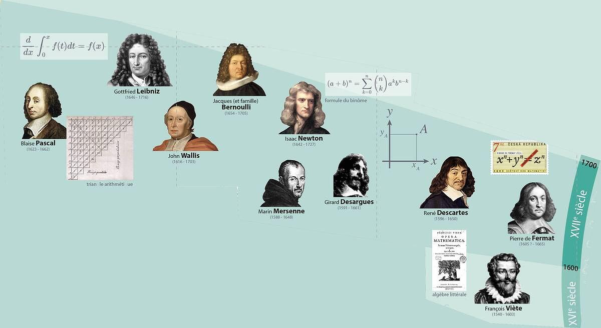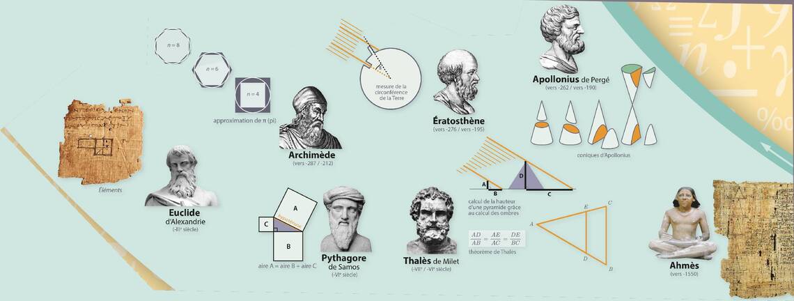 Les collégiens pourront retrouver des savants grecs comme Pythagore ou Thalès, des auteurs indiens, arabes ou médiévaux (comme Fibonacci) pour illustrer la numération décimale positionnelle, l’algèbre ou des résultats de géométrie… Surtout des noms antérieurs au XVIIe siècle.