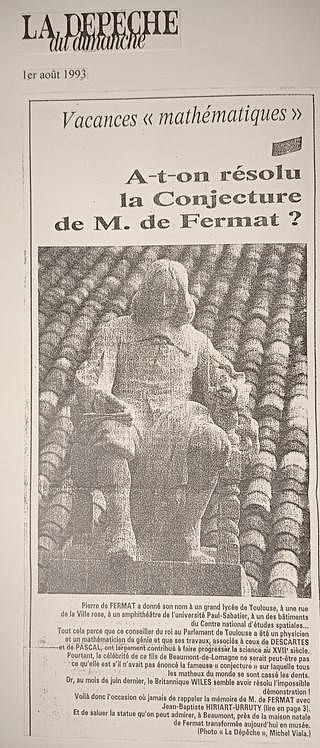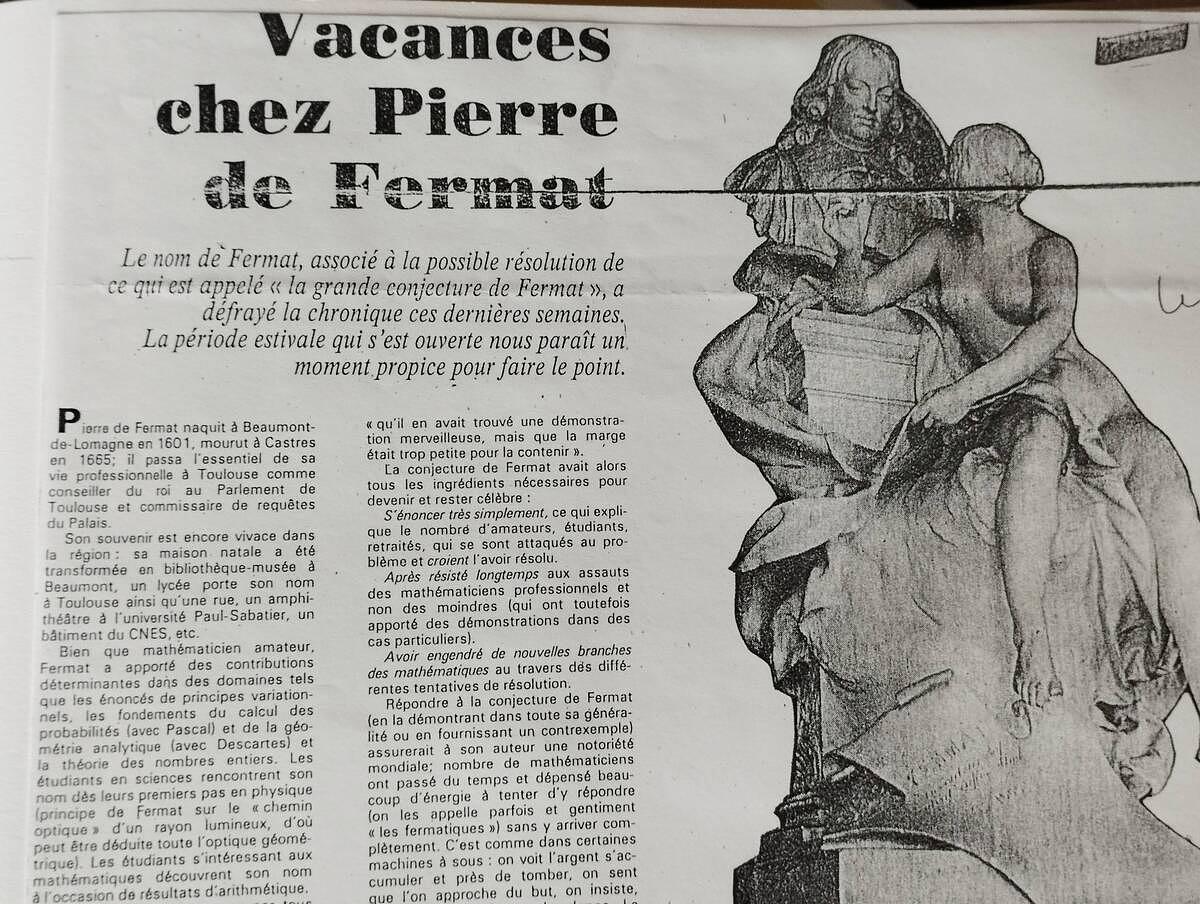 « Il y a 30 ans exactement, le 23 juin 1993, Andrew Wiles finissait une série de trois communications dans un colloque qui se tenait à l'université de Cambridge ; le dernier exposé se terminait par l'annonce de la résolution (par lui) de la grande question de Fermat (FLT = Fermat Last Theorem). Aussitôt, les réseaux sociaux (déjà) s'emballent, la presse s'empare du sujet... Le soir même, le journal télévisé de TF1 relaie l'annonce de Wiles… Je fais une affichette papier à ce sujet et l'appose au bâtiment 1R2 à l’université Paul Sabatier.Quatre semaines plus tard, La Dépêche du Midi (DdM) me contacte et me demande de rédiger, d'urgence, un papier sur le sujet pour la parution du dimanche suivant... J'écris quelques pages, à marche forcée, et l'article paraît avec une annonce de première de couverture le dimanche 1er août 1993… »