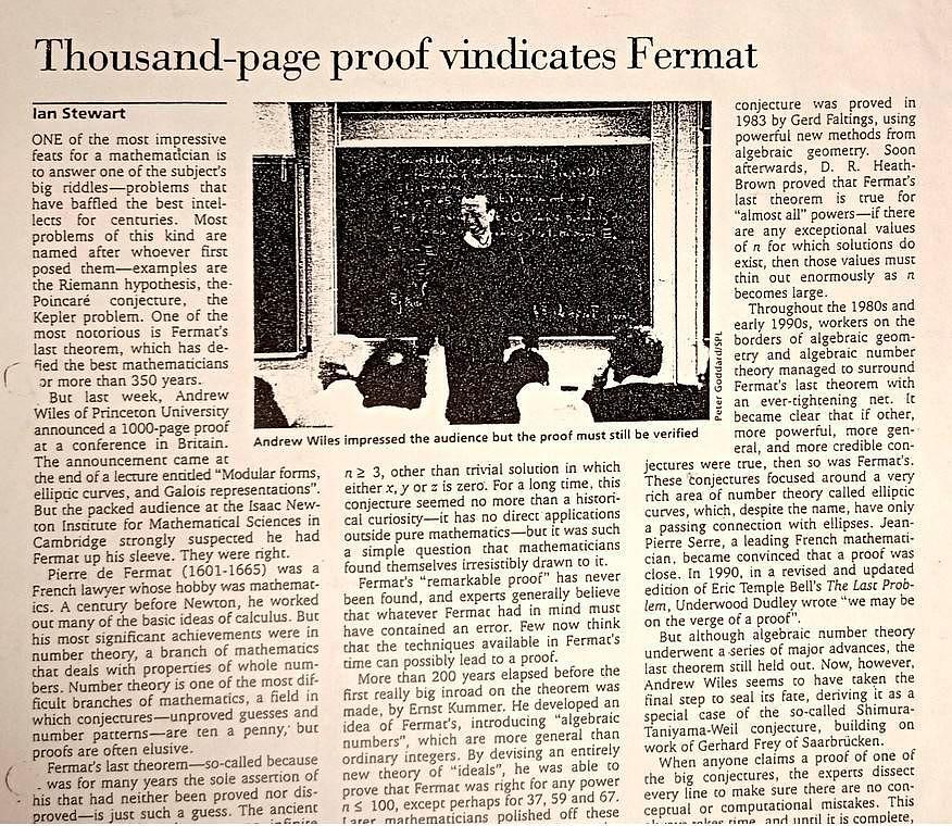 L’effervescence médiatique créée par l'annonce de la démonstration d’Andrew Wiles est en effet sans précédent. Les journaux et les magazines les plus prestigieux de France et du monde, dans leurs éditions spéciales, rendent compte de l’extraordinaire nouvelle : la fameuse conjecture que Pierre de Fermat a évoquée dans les marges de son ouvrage de Diophante est enfin démontrée après plus de 350 ans de tentatives infructueuses. L’émotion est à son comble. Andrew Wiles et son illustre prédécesseur se disputent la vedette à la une des publications les plus savantes comme les plus populaires.