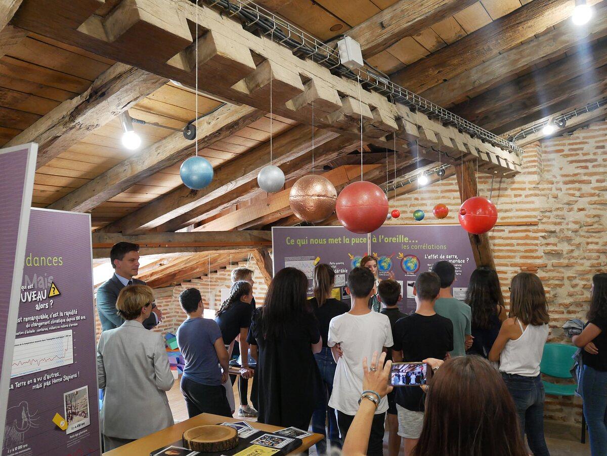 Au cours de la visite de la maison natale de Pierre Fermat guidée par Claire Adélaïde Montiel, présidente de l’association Fermat Science, Benoît Delaunay s’est montré curieux de l’histoire hors du commun du plus ancien habitant de cette demeure, Pierre Fermat, juriste passionné de mathématiques qui depuis des siècles continue à apporter ses lumières aux mathématiques contemporaines. Avant de découvrir, du haut de la tour une vue imprenable sur la structure urbanistique de la bastide restée intacte depuis le XIII° siècle, il a croisé dans ce bel hôtel particulier du XVI° siècle, les 55 élèves du collége Jean Paul Laurens d’Ayguevives venus passer la journée à Beaumont avec M. Souza, principal et leurs professeurs dans le cadre de l’action Les enfants du patrimoine organisée avec l’aide du CAUE (Centre d’architecture et d’urbanisme et de l’environnement) de Tarn-et-Garonne. Au programme de cette riche journée : chasse au théorème dans la bastide, initiation aux arcanes de la création du jeu de dobble, et enquête à la recherche d’indices et d’explications des changements climatiques grâce à l’exposition créée par Science animation : Changement climatique, Comment sait-on ce que l’on sait ?