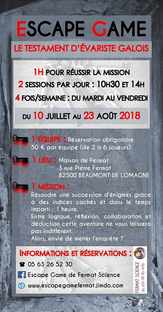 Pour les familles ou groupe d’amis intrépides, venez vous confronter à l’Escape Game de Fermat qui se déroulera du 12 juillet au 23 aout dans la cave de la maison natale de Pierre Fermat… Une heure, aidé par un Game Master, pour résoudre de nombreuses énigmes dans un décor du XIXème siècle. Réussirez vous à sauver le testament d’Evariste Galois ?  (50€ pour un groupe max de 6 personnes – sur réservation)