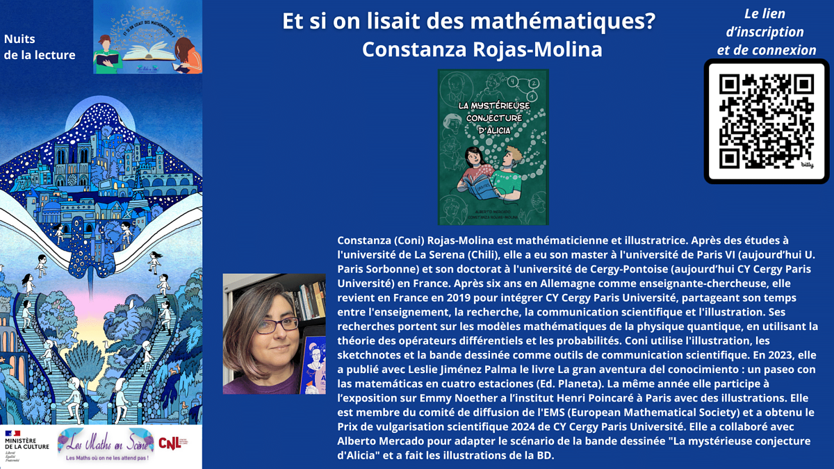 Constanza (Coni) Rojas-Molina est mathématicienne à CY Cergy Paris Université et illustratrice. Coni utilise l'illustration, les sketchnotes et la bande dessinée comme outils de communication scientifique.