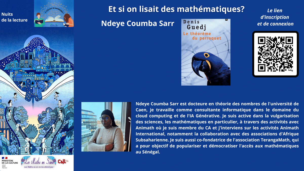 Ndeye Coumba Sarr, docteure en théorie des nombres de l'Université de Caen, est une consultante en informatique spécialisée dans le cloud computing et l'IA générative. Passionnée par la vulgarisation scientifique, elle a cofondé TerangaMath pour démocratiser les mathématiques au Sénégal. Elle vous fera redécouvrir "le théorème du Perroquet" de Denis Guedj.