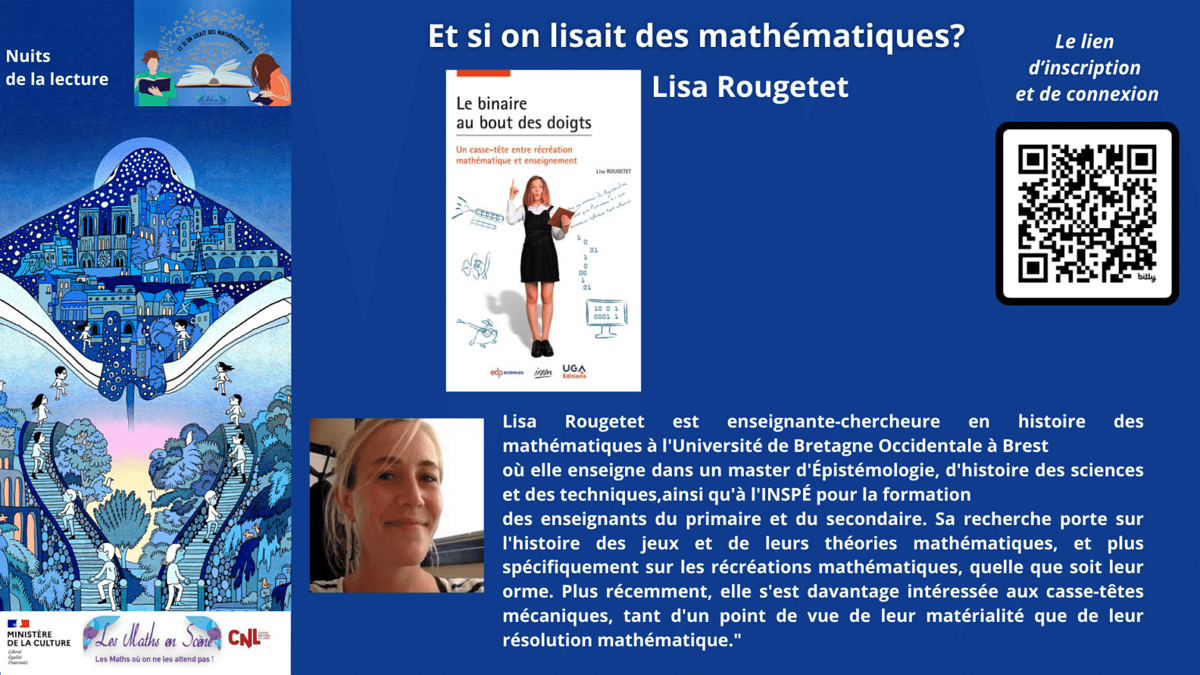 Lisa Rougetet est enseignante-chercheure en histoire des mathématiques à l'Université de Bretagne Occidentale à Brest, où elle enseigne dans un master d'Épistémologie et à l'INSPÉ. Ses recherches portent sur l'histoire des jeux mathématiques, notamment les récréations mathématiques et les casse-têtes mécaniques, explorant leur matérialité et leur résolution mathématique. Elle vous fera découvrir son livre "Le binaire au bout des doigts".
