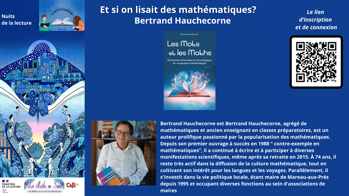 Bertrand Hauchecorne, agrégé de mathématiques et auteur prolifique, a consacré sa carrière à populariser les mathématiques à travers de nombreux ouvrages, du "Contre-exemples en mathématiques" (1988) à "Biographie des grands théorèmes" (2023). Ancien professeur en classes préparatoires, il reste actif dans la diffusion de la culture mathématique tout en s'impliquant dans la vie politique locale en tant que maire de Mareau-aux-Prés depuis 1995. Il vous fera découvrir son nouveau livre "Les Mots et les Maths".