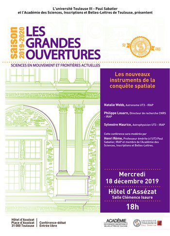 Organisées par l'université Toulouse III - Paul Sabatier et l'Académie des Sciences, Inscriptions et Belles-Lettres de Toulouse, la prochaine conférence du cycle les "Grandes Ouvertures" vous propose de découvrir trois grands instruments dédiés à la conquête spatiale.