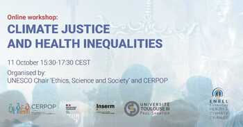 Dans le cadre de la prochaine conférence transdisciplinaire sur la thématique : « Connecter la santé et le changement climatique » du projet ENBEL, Horizon 2020, la Chaire UNESCO Éthique, Science et Société (Université de Toulouse, Responsable Pr E. Rial-Sebbag) et CERPOP (Inserm, Université Toulouse III) organisent un atelier sur certains aspects de la justice climatique et des inégalités de santé.