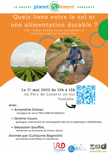 Pour la Fascination of Plants Day 2022, dans le cadre du projet Planet@liment, le 17 mai 2022 de 12h à 13h à la salle pédagogique du Parc de Lunaret, l'IRD s'associe à Cosciences pour réunir des professionnels de l’agriculture et une chercheuse afin de discuter de « sol vivant » et des enjeux liés à une production alimentaire durable.