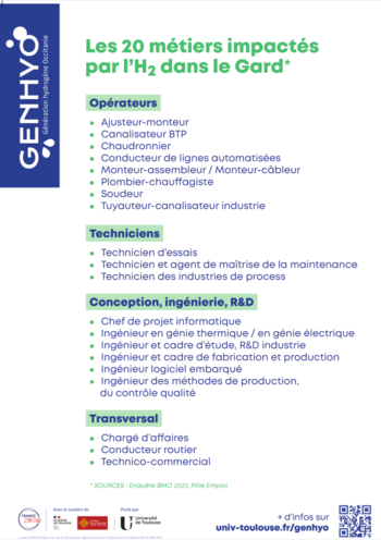 Pour une visibilité plus concrète, une liste des 20 principaux métiers d'Occitanie impactés par la filière hydrogène a été conçue. Ces métiers ont été divisés en quatre familles dont chacune correspond à un niveau de formation (Bac, bac infra, bac +2, bac +3, bac +5). Afin d’avoir une optique territoriale nous avons sélectionné 20 métiers pour chaque département de la région.Ce sont des métiers déjà existants qui nécessitent de « colorer » à l’hydrogène.