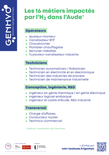Pour une visibilité plus concrète, une liste des 20 principaux métiers d'Occitanie impactés par la filière hydrogène a été conçue. Ces métiers ont été divisés en quatre familles dont chacune correspond à un niveau de formation (Bac, bac infra, bac +2, bac +3, bac +5). Afin d’avoir une optique territoriale nous avons sélectionné 20 métiers pour chaque département de la région.Ce sont des métiers déjà existants qui nécessitent de « colorer » à l’hydrogène.