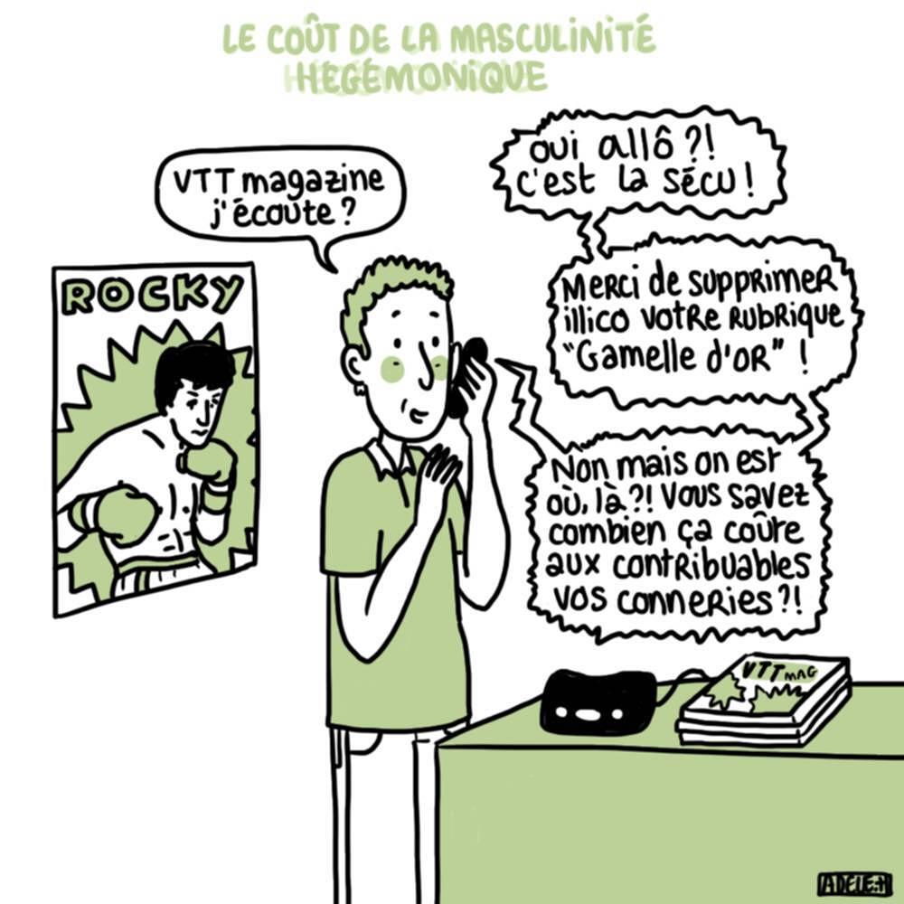 Les magazines de VTT offrent aux lecteurs et aux lectrices des représentations de sportifs où dominent la puissance, la performance et certaines formes de violence sur soi. Les éléments discursifs « puissance, puissant, force, fort », les comparaisons à des animaux sauvages tels que « le tigre », sont nombreux de même que les références à des personnages célèbres évoquant la puissance comme le boxeur de la série cinématographique “Rocky”. Les photographies qui accompagnent les articles participent aussi à ce processus de valorisation en se focalisant sur le muscle – gros plans sur les cuisses du vététiste en plein effort – ou en montrant des actions spectaculaires : sauts, freinages avec nuage de poussière par exemple. L’autre caractéristique reste la violence au travers de la glorification des blessures et de la prise de risque. Une rubrique baptisée « La gamelle d’or » illustre parfaitement cette mise en scène de la violence. Présente dans la revue Vélo Vert jusqu’à 2010, il s’agit pour les lecteurs d’envoyer une photo après un accident grave, accompagnée d’un petit texte explicatif. Le gagnant se voit attribuer un an d’abonnement gratuit à la revue sous conditions d’un séjour à l’hôpital et de stigmates corporels visibles et durables. Puissance, violence et performance confèrent à ces mises en scène du masculin une impression de virilité exacerbée. La virilité est à entendre comme un attribut corporel, sexuel, économique et social idéalisé d’une forme de masculinité dominante et valorisée que la sociologue australienne Raewyn Connell appelle la masculinité hégémonique.