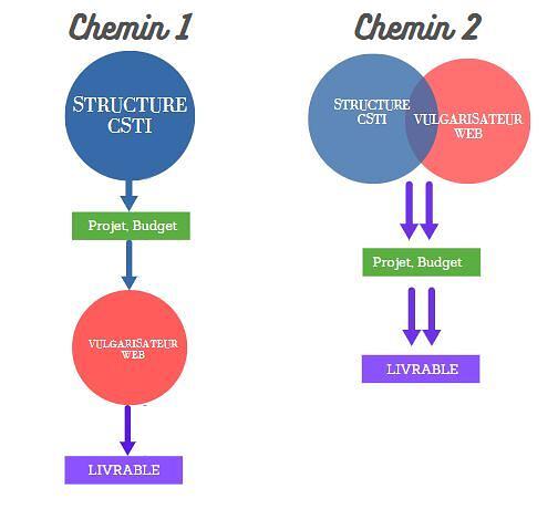 Le chemin 2 présuppose que la structure de CSTI connaît déjà un vulgarisateur compétent (l’équipe du Café des Sciences peut être mise à contribution sur le sujet). Le projet, voire le budget sont alors co-construits. Cette configuration favorise les vulgarisateurs « confirmés » mais permet une cohérence totale entre les objectifs et les livrables.