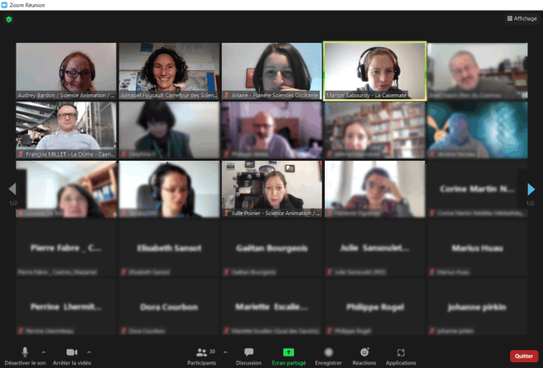 Les échanges ont commencé en abordant le projet Galaxie, présenté par Marion Sabourdy : au cours d’une dizaine d’ateliers portant sur des médias/supports différents, les participant.e.s ont été amenés à construire un univers de SF : cadre et personnages principaux, en dessin, sur des supports audio et vidéo, des affiches, objets, un jeu vidéo etc. Le but était ainsi de toucher un public de niche : les passionnés de science-fiction, afin de les faire venir dans le centre de culture scientifique. Une expérience très riche en partenariat avec une marraine et un parrain scientifiques, dont ont pu bénéficier des amateurs de science-fiction ados et jeunes adultes notamment. Les scientifiques passaient de groupe en groupe afin d'apporter leur expertise, faisant ainsi évoluer le scénario (qui portait sur la matière noire). L’une des difficultés principales résidait dans la cohérence narrative puisque le public n’était pas le même à chaque séance. Cependant, le groupe a pu se retrouver chaque semaine avec le plaisir d’avancer ensemble dans cet univers onirique de science fiction. Cette expérience nécessite une bonne préparation en amont afin de recruter du public et de jouer au mieux le rôle de facilitateur pendant les ateliers.