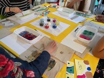 Le public sera invité à créer son propre carnet de papier marbré, équipé pour le concevoir de pots en verre contenant des camaïeux de bleus et de vert