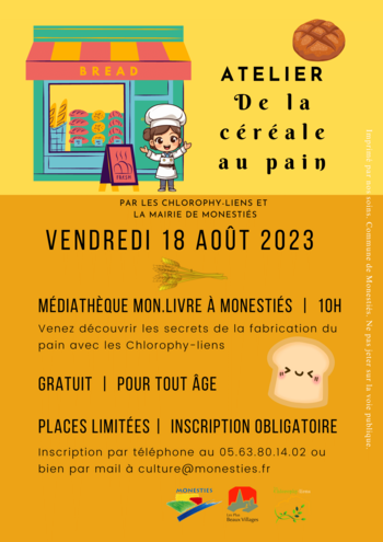 Dans le cadre de la programmation départementale DeMain en MAIN(S) transmettre un savoir faire, le service Culture de la Mairie de Monestiés et Les Chlorophy-liens, paysans-boulangers, vous proposent un atelier pédagogique « De la céréale au pain » le vendredi 18 août 2023 à 10h à la médiathèque Mon.Livre de Monestiés. Venez découvrir en famille les secrets de fabrication du pain et dégustez le !