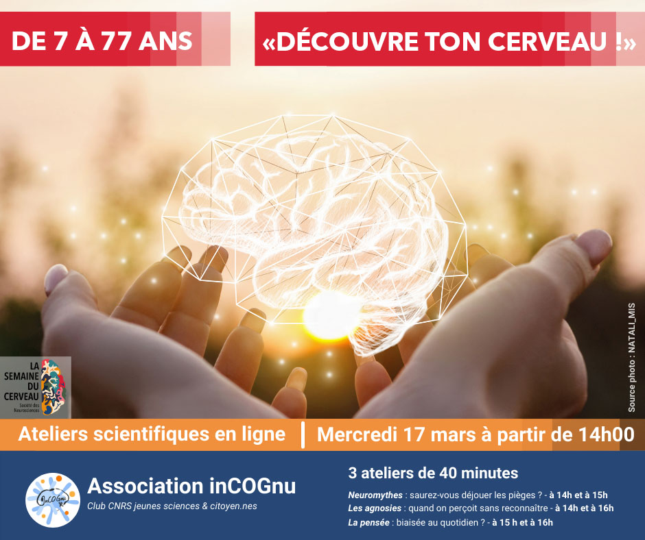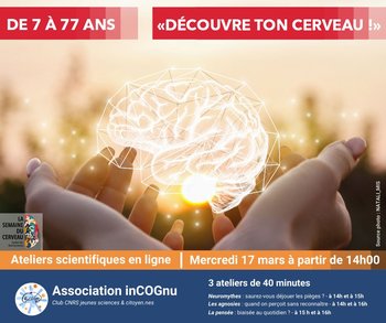 La semaine prochaine, du 15 au 21 mars 2021, sera rythmée par des animations et conférences organisées dans le cadre de la Semaine du Cerveau. Cette année encore, l'association InCOGnu a le plaisir de vous annoncer sa participation à cet événement qui se tiendra en ligne.