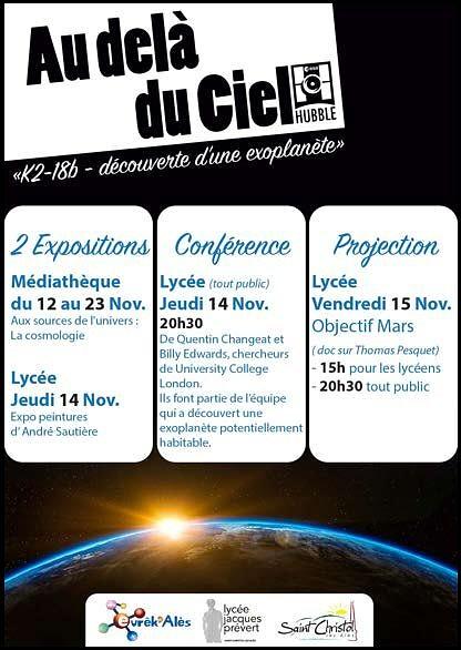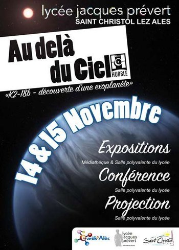 • Conférence par Quentin Changeat et Billy Edwards de l'University Collège London sur le thème des exo planètes le jeudi 14 novembre 20h30 en salle polyvalente du lycée Prévert