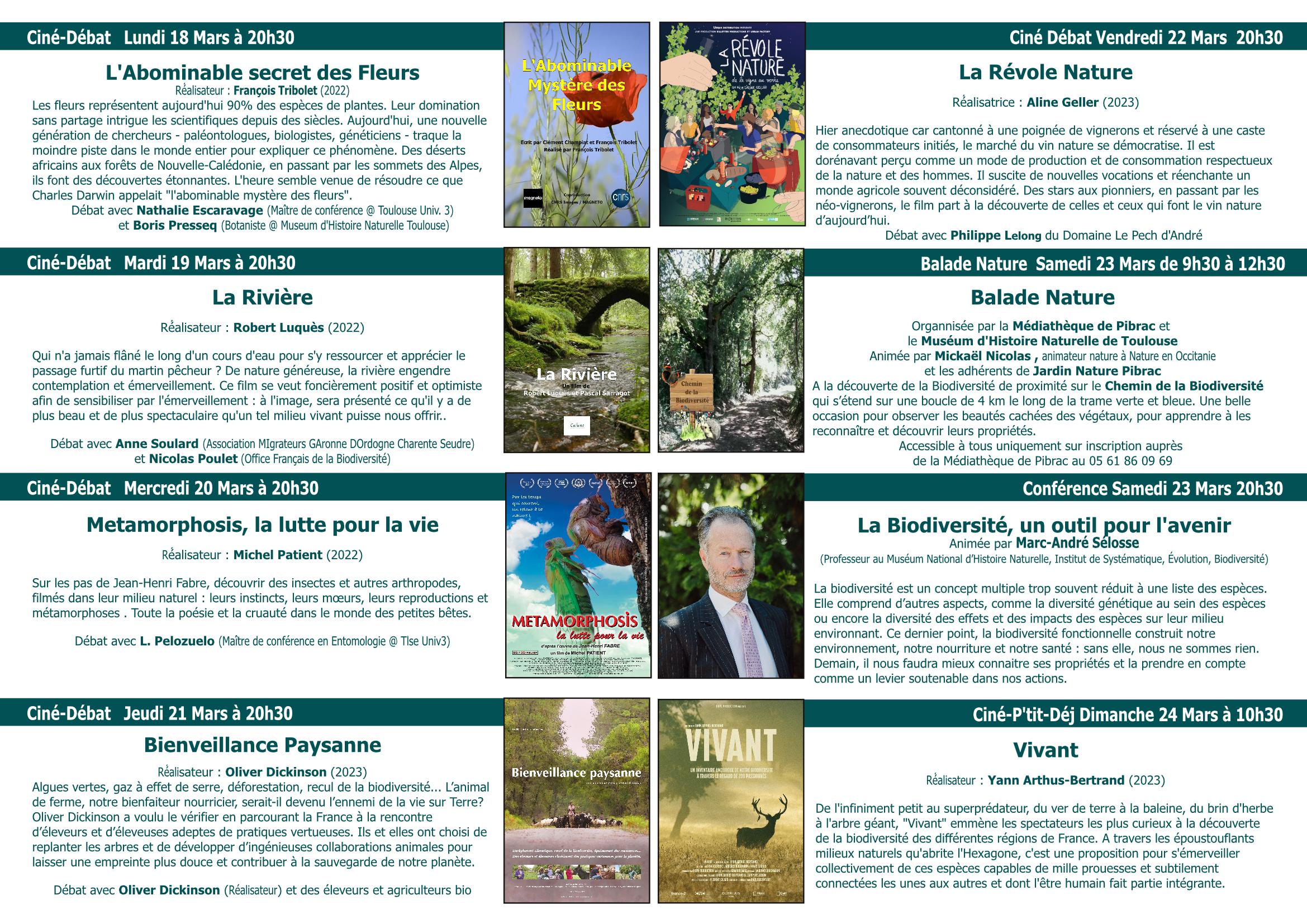 La conférence du samedi 24 aura pour titre Biodiversité : un outil pour l’avenir, elle sera animée par M. Marc André Selosse Professeur au Museum d’Histoire Naturelle de Paris et auteur de nombreux ouvrages à propos de la biodiversité. Le dimanche matin, l’association offre le petit’dej avant la projection du film tout public « Vivant » dans la salle polyvalente à Pibrac.