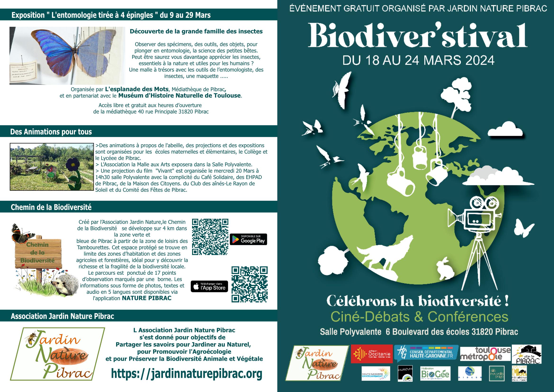 La 6e édition de « Biodiver’Stival Fêtons la Biodiversité » aura lieu du 18 au 24mars 2024 dans la salle polyvalente, 6 boulevard des écoles à Pibrac (31820) : une semaine consacrée à la biodiversité locale, végétale et animale, pour sensibiliser petits et grands à l’impérieuse nécessité de protéger notre environnement.