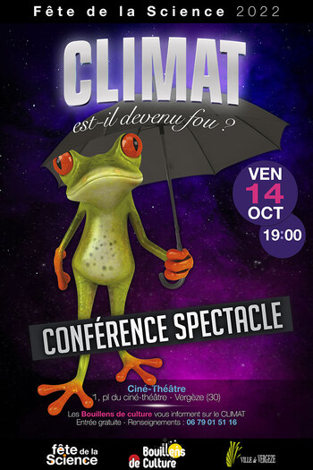 Une conférence pour toute la famille, ludique et interactive pour comprendre le changement climatique animée par Cyril Dufer, intervenant de l'organisation Bio-Sphère. La conférence sera interactive au moyen de boîtiers de vote électroniques distribués aux participants qui permettront à intervalles réguliers de répondre à des questions posées par l'animateur. La conférence sera accompagnée d'images et de vidéos exceptionnelles projetées en haute définition sur grand écran. Entrée libre et gratuite dans la limite des places disponibles.