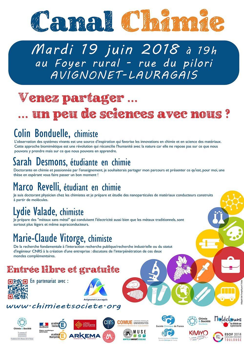 * Le projet Canal Chimie recouvre des actions de « Chimie et Société Occitanie » et ses partenaires dans des villes et villages de la région Occitanie-Pyrénées Méditerranée, bordant le Canal du Midi et le Canal latéral à la Garonne du 29 mai au 5 juillet 2018. www.chimieetsociete.org